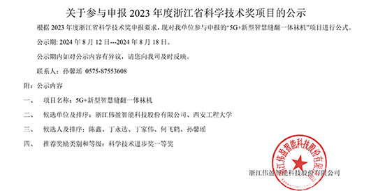 根據 2023 年度浙江省科學技術獎申報要求,現對我單位參與申報的“5G+新型智慧縫翻一體襪機”項目進行公式。